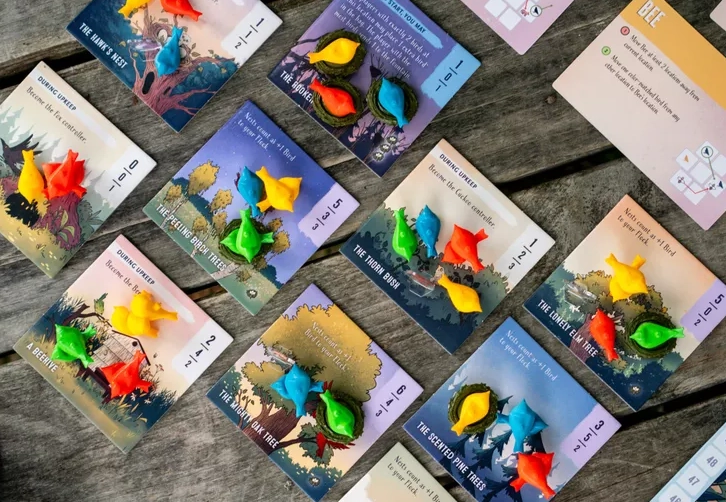 Os turnaréis para apilarlos en las casillas de ubicación. Cada ficha de ubicación da puntos variables por mayorías, y a veces da habilidades únicas. ¡Consigue muchos puntos, posa a la mayor cantidad de pájaros en las localizaciones, expulsa a tus enemigos y desempata para conseguir ventaja! Tras cinco rondas, quien haya conseguido más puntos, ganará.