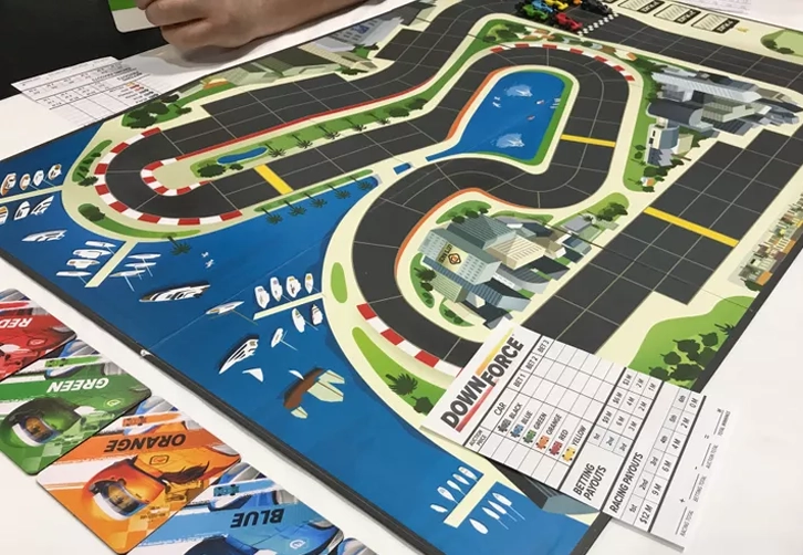 Este es un juego cuyo diseño no necesitaba atención. Años de juego y múltiples versiones lo han perfeccionado hasta casi la perfección. Por el contrario, uno de los desafíos del diseño fue determinar cuál de los muchos módulos de reglas incorporar para crear la versión más divertida. Downforce también agrega poderes variables al jugador para mejorar la rejugabilidad. Pero sobre todo, mejora el aspecto del juego para hacerlo atractivo y fácil de jugar. Se prestó especial atención a los colores, la disposición de las cartas, el diseño de los coches, los detalles del tablero y más.