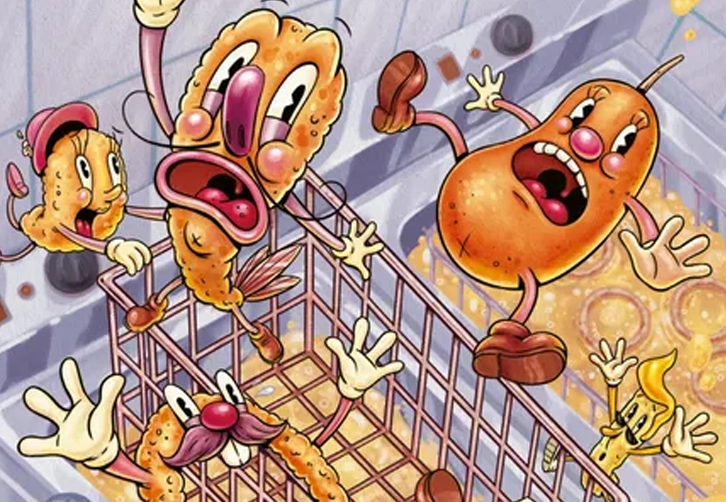 Fritanga es un juego de cartas muy peculiar, porque la zona de juego es una freidora… Los jugadores asumen el control de varios alimentos e intentan sobrevivir a toda costa, saltando de un lado a otro de la cesta de la freidora, pero cuando un jugador no puede moverse… caerá en el aceite y será eliminado. Incorpora tres modos de juego: todos contra todos, apto para 2 a 6 jugadores; el modo contra el chef, una versión semi-cooperativa para grupos de 3 a 7 jugadores, en el que uno será el chef e intentará freír al resto de jugadores; y el modo por equipos, en el que dos grupos iguales compiten para ganar.