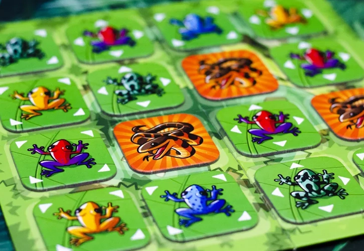 Also included are four Snake Tiles which remove any one face up Frog Tile from the game. Both the Frog and Snake are discarded, freeing up a space for a new tile to be played.