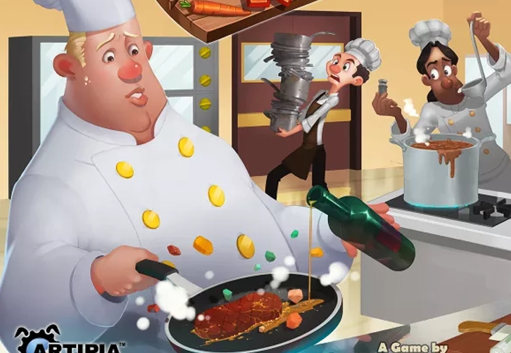 - Desplegar el tablero y repartir a cada persona una tablilla de cocina y 2 relojes de arena que son los trabajadores.