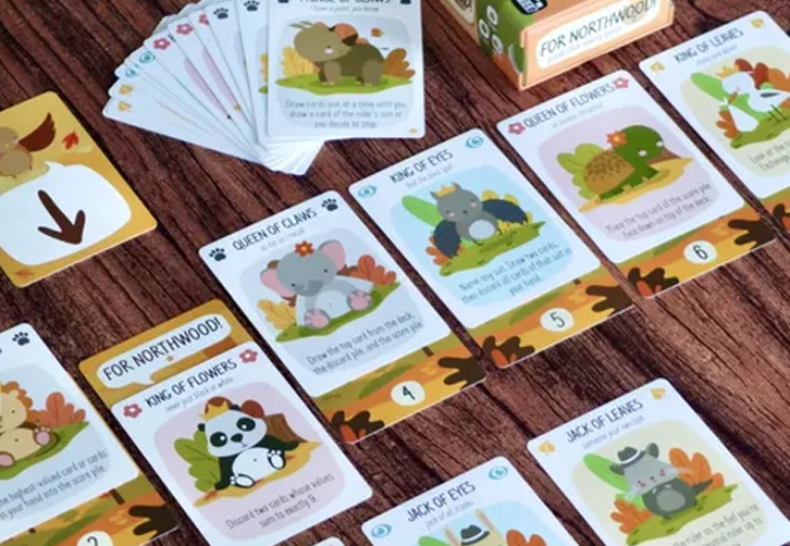 ¡Por Northwood! Es un juego de manejo de manos en solitario y trucos de precisión. Tu objetivo es unificar pacíficamente el reino de Northwood a través de conversaciones con sus gobernantes. Durante ocho rondas, debes visitar ocho feudos de animales y entablar un diálogo con sus gobernantes (trucos). El palo de cada gobernante representa el triunfo de ese feudo. Cada gobernante también requiere que ganes una cantidad exacta de trucos para unirte a tu alianza, por lo que el juego se vuelve más difícil a medida que tus opciones disminuyen.