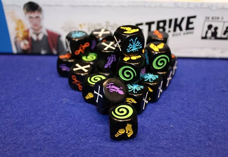 Harry Potter Strike Dice Game combina elementos de Strike e Impact, con jugadores tirando dados en una arena para intentar lanzar hechizos y recuperar dados de la arena.